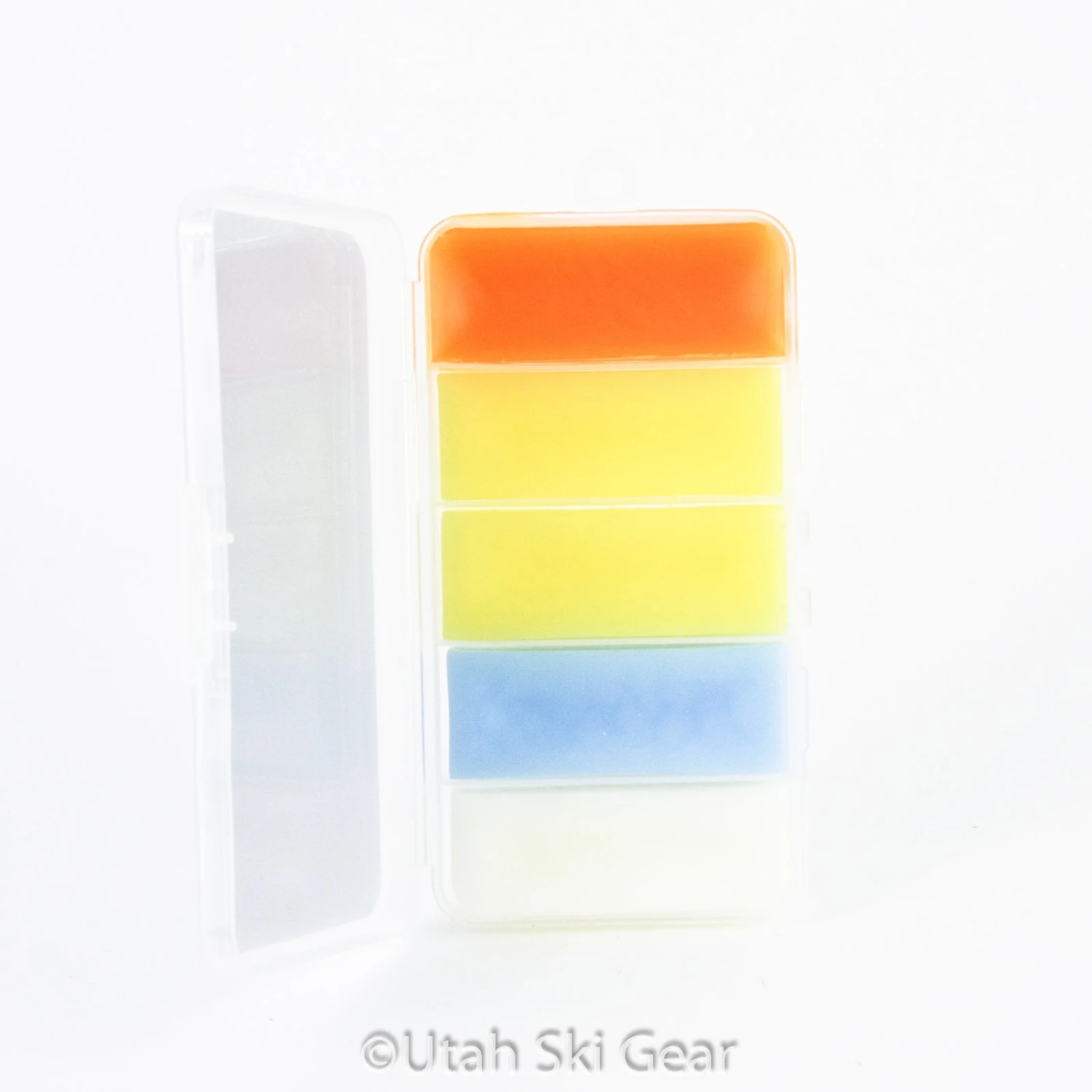 This 5-pack of wax includes a sampling of Racervice’s baseline wax collection all in one combi pack for a total of 245g of wax. All 5 are non-fluorinated wax that penetrates deeply into the pores of your ski or snowboard bases and creates a prime surface that readily accepts glide waxes and additives. The pack covers all temps and conditions in low humidity (<40%). Because of its versatility, there are ninety grams of our most popular wax (ZF2).